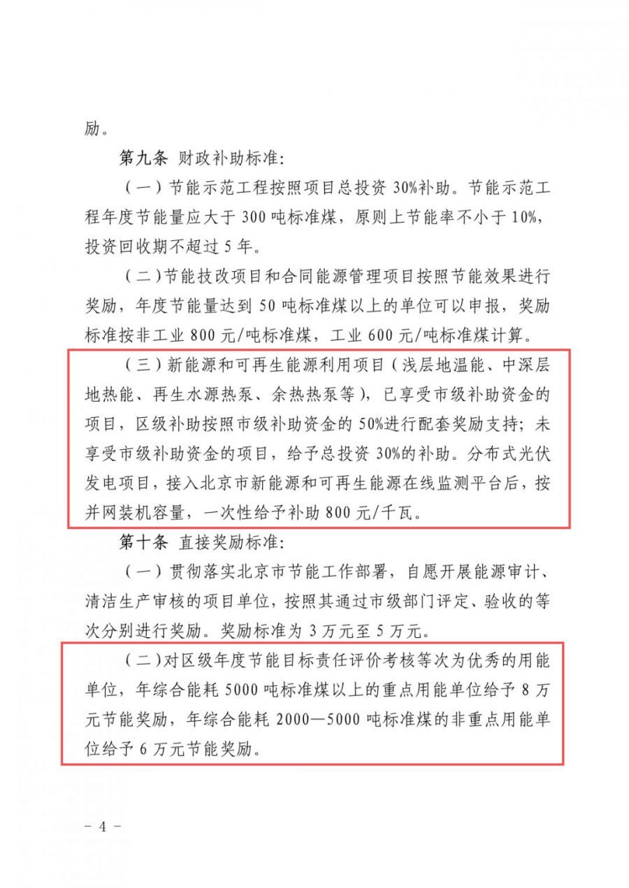 通知明確:新能源和可再生能源利用項(xiàng)目已享受市級(jí)補(bǔ)助資金的項(xiàng)目,區(qū)級(jí)補(bǔ)助按照市級(jí)補(bǔ)助資金的50%進(jìn)行配套獎(jiǎng)勵(lì)支持;未享受市級(jí)補(bǔ)助資金的項(xiàng)目,給予總投資30%的補(bǔ)助。分布式光伏發(fā)電項(xiàng)目,接入北京市新能源和可再生能源在線監(jiān)測平臺(tái)后,接并網(wǎng)裝機(jī)容量,一次性給予補(bǔ)助800元/千瓦。