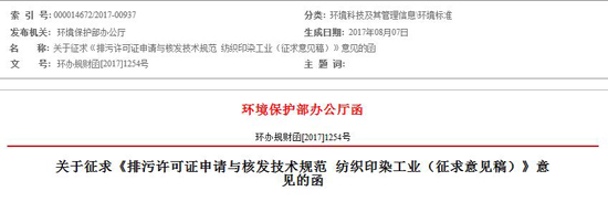 關(guān)于征求《排污許可證申請與核發(fā)技術(shù)規(guī)范紡織印染工業(yè)(征求意見稿)》意見的函