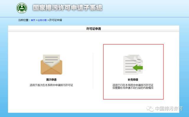 正確的操作是——進入“國家排污許可證信息公開系統”的“申請子系統”(http://permit.mep.gov.cn/permitExt/outside/LicenseRedirect),進行“補充申請”。
