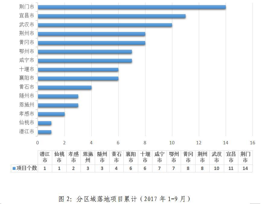 2017年1-9月,累計(jì)新落地項(xiàng)目數(shù)排名:荊門市(14個(gè))、宜昌市(11個(gè))、武漢市(10個(gè))、荊州市(8個(gè))、黃岡市(8個(gè))、荊州市(8個(gè))、鄂州市(7個(gè))、咸寧市(7個(gè))、十堰市(6個(gè))、襄陽(yáng)市(6個(gè))、黃石市(4個(gè))、隨州市(3個(gè))、恩施州(3個(gè))、孝感市(2個(gè))、仙桃市(1個(gè))、潛江市(1個(gè))。