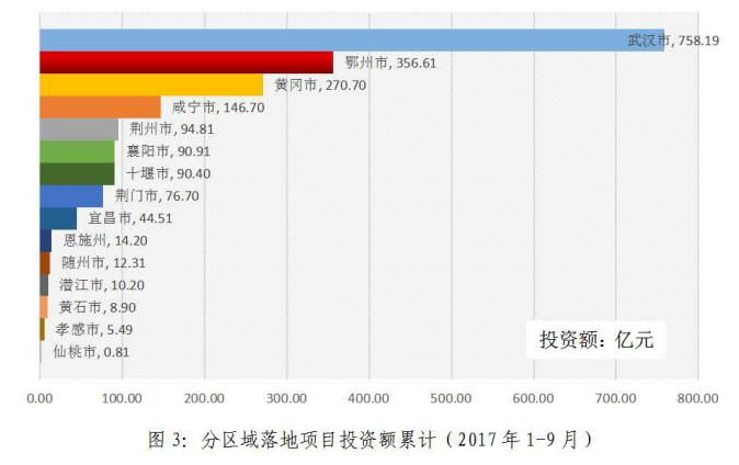 2017年1-9月,累計(jì)新落地項(xiàng)目投資額排名:武漢市(758.19億元)、鄂州市(356.61億元)、黃岡市(270.70億元)、咸寧市(146.70億元)、荊州市(94.81億元)、襄陽(yáng)市(90.91億元)、十堰市(90.40億元)、荊門市(76.70億元)、宜昌市(44.51億元)、恩施州(14.20億元)、隨州市(12.31億元)、潛江市(10.2億元)、黃石市(8.90億元)、孝感市(5.49億元)、仙桃市(0.81億元)。