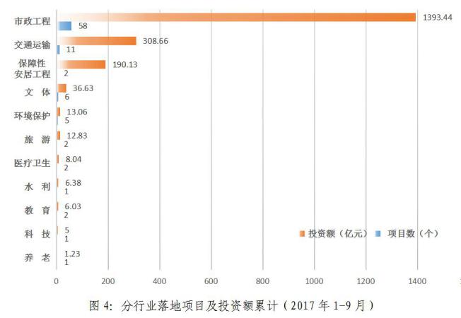 2017年1-9月,累計(jì)新落地項(xiàng)目投資額排名:市政工程(1393.44億元)、交通運(yùn)輸(308.66億元)、保障性安居工程(190.13億元)、文體(36.63億元)、環(huán)境保護(hù)(13.06億元)、旅游(12.83億元)、醫(yī)療衛(wèi)生(8.04億元)、水利(6.38億元)、教育(6.03億元)、科技(5億元)、養(yǎng)老(1.23億元)。