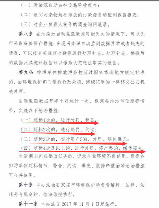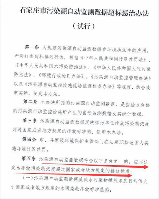 近日河北石家莊市環保局印發《石家莊市污染源自動監測數據超標懲治辦法(試行)》(以下簡稱“辦法”)。辦法明確,企業污染源自動監測數據出現超標將被處罰,超標4次及以上,將停產整治。辦法自11月1日起施行。