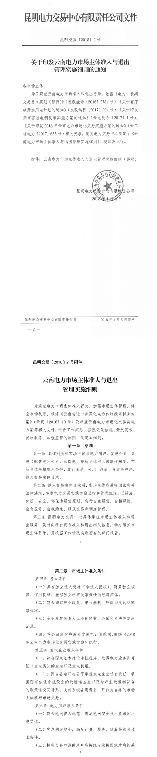 昆明電力交易中心日前發布了《云南電力市場主體準入與退出管理實施細則》,發電企業的準入條件:取得電力業務許可證(發電類)的發電廠及發電機組。電力用戶:符合電網接入規范,滿足電網安全技術要求的用電實體。擁有自備電源的用戶應按規模承擔國家政府性基金及附加、政策性交叉補貼和系統備用費等相關費用。售電公司、擁有售電網運營權的售電公司執行《云南省售電側改革實施方案》確定的準入條件。