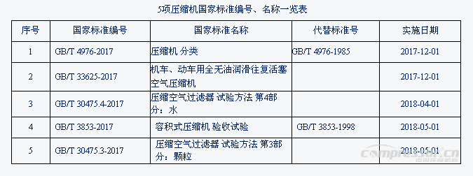 2017年第11號(hào)、第23號(hào)、第29號(hào)中華人民共和國國家標(biāo)準(zhǔn)公告,由國家質(zhì)量監(jiān)督檢驗(yàn)檢疫總局、國家標(biāo)準(zhǔn)化管理委員會(huì)批準(zhǔn)發(fā)布了共5項(xiàng)壓縮機(jī)國家標(biāo)準(zhǔn),具體內(nèi)容見表: