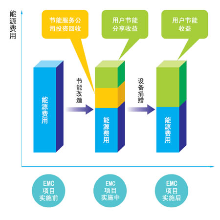 EMC 為客戶提供能源系統(tǒng)診斷、節(jié)能項目可行性分析、節(jié)能項目設計,幫助項目融資,選擇并采購設備、安裝調試、進行項目管理、培訓操作人員、合同期內系統(tǒng)設備維 護、節(jié)能量監(jiān)測等一條龍服務,然后與客戶共同驗證項目的節(jié)能效果、環(huán)境效益與經(jīng)濟效益,最后,與客戶分享項目實施后取得的經(jīng)濟效益,回收項目的投資和獲得 應有的利潤。